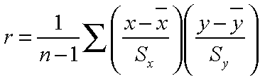 - Calculated by taking the ratio of the sample covariance of the two variables to the product of the two standard deviations.