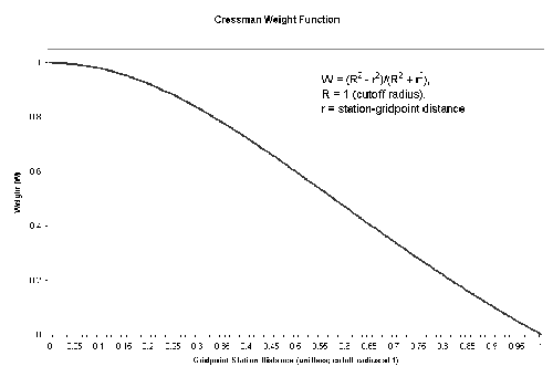 The Cressman analysis assigns weighted values of the observed stations to the model initialization, similar to the interpolation technique described above.