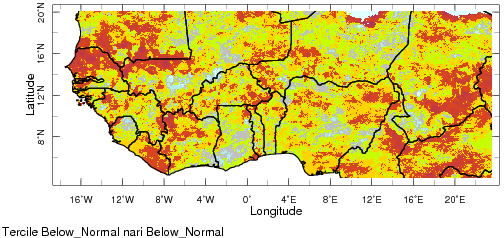 Cette analyse n'est pas une prédiction et est entièrement basée sur des observations historiques des pluies et de la TSM. Il a été démontré que la variabilité inter-annuelle et décennale de la température de Surface de l'Atlantique Nord pouvait influencer la distribution des pluies en Afrique de l'Ouest. L'index nari est défini comme la différence entre la moyenne spatiale de la TSM sur l'Atlantique Nord (5˚W-15˚W, 10˚N-40˚N) avec celle sur les Tropiques Globaux (20˚S-20˚N). Les catégories, Sous la Normale, Près de la Normale et Au-dessus de la Normale, sont définies en fonction de leur éloignement de la moyenne historique, respectivement, à 0,5 écart-type ou moins, à plus ou moins 0,5 écart-type, et à 0,5 écart-type ou plus. Cette Maprooms permet d'explorer et de mieux comprendre cette relation statistique, en vue de créer de meilleures prédictions climatiques pour l'Afrique de l'Ouest.